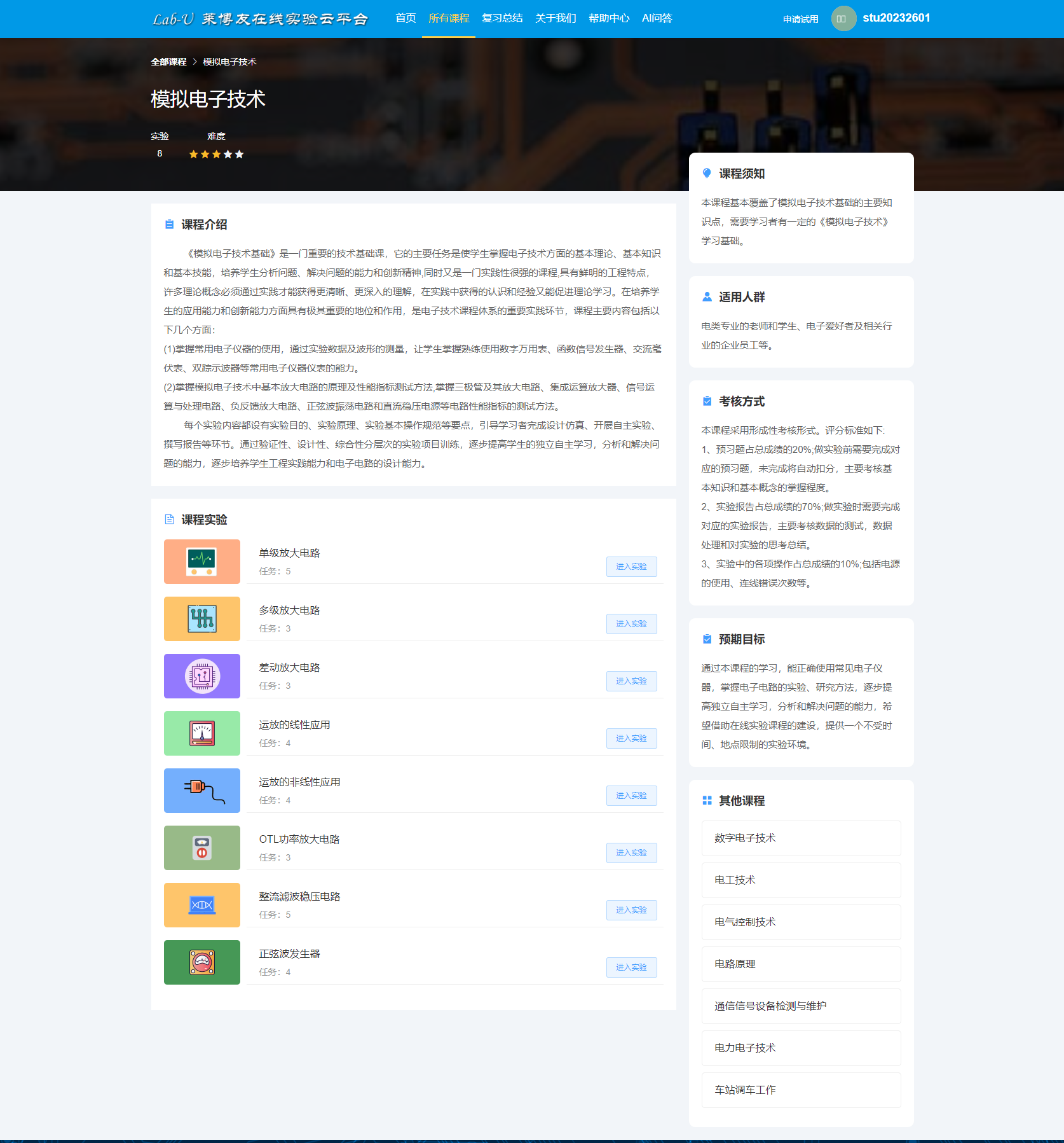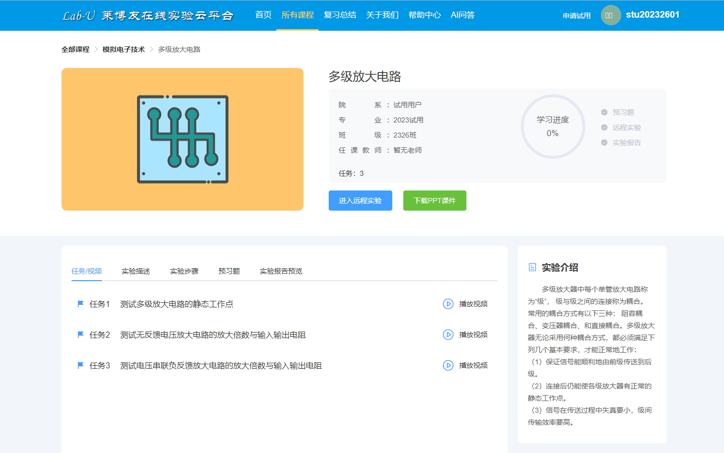 打开软件登录后,点击导航栏 “所有课程”,选择 “模拟电子技术”,选择准备要做的实验项目。这里我们以选择 “多级放大电路” 为例,单击“多级放大电路”,进入多级放大电路实验详情页面。如图3-1所示。