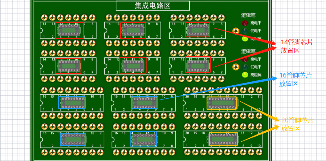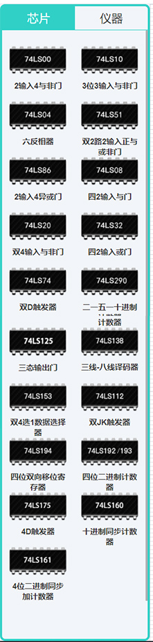 如图1-1为逻辑芯片组件区,有19种常用芯片,我们做实验时,鼠标点击选择对应的芯片,拖动到集成电路区即可完成芯片的选择。