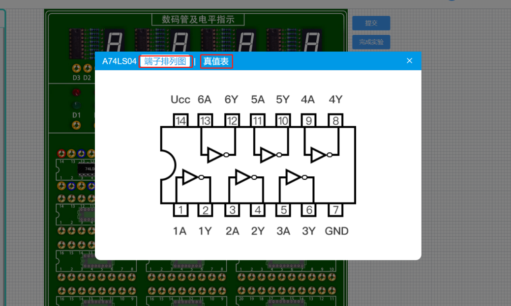 点击拖动到电路区的芯片按钮,则会显示该芯片的端子排列图、真值表,如图1-3所示: