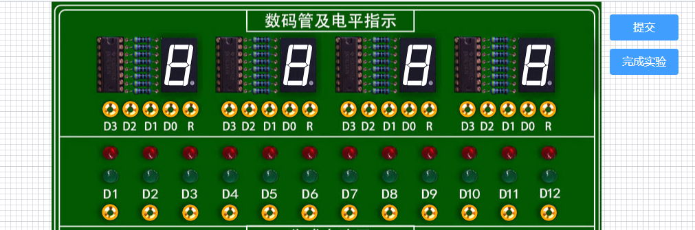 数码管显示 :4位BCD码二进制七段译码器SN74LS47D与相应的共阳LED数码显示管已经连接好。实验时,只需要在每一位译码器的四个输入端D0、D1、D2、D3处加入0000~1001之间的代码,数码管即显示出0~9的十进制数字。输入端R控制数码管小数点位,低电平有效。
