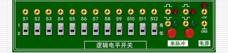 逻辑电平开关区 :由12位带显示拨码开关和对应输出端口组成。当开关向上拨,置于“1”时输出为高电平;当开关向下拨,置于“0”时输出为低电平。
