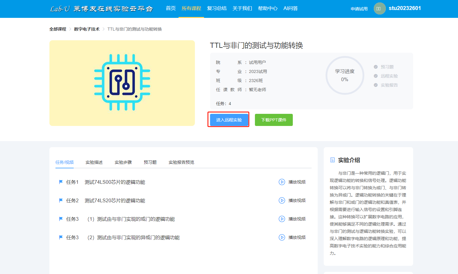 单击TTL与非门的测试与功能转换实验界面中 “在线实验” 模块下的 “进入远程在线实验” ,进入实验操作界面,如图1-1所示。