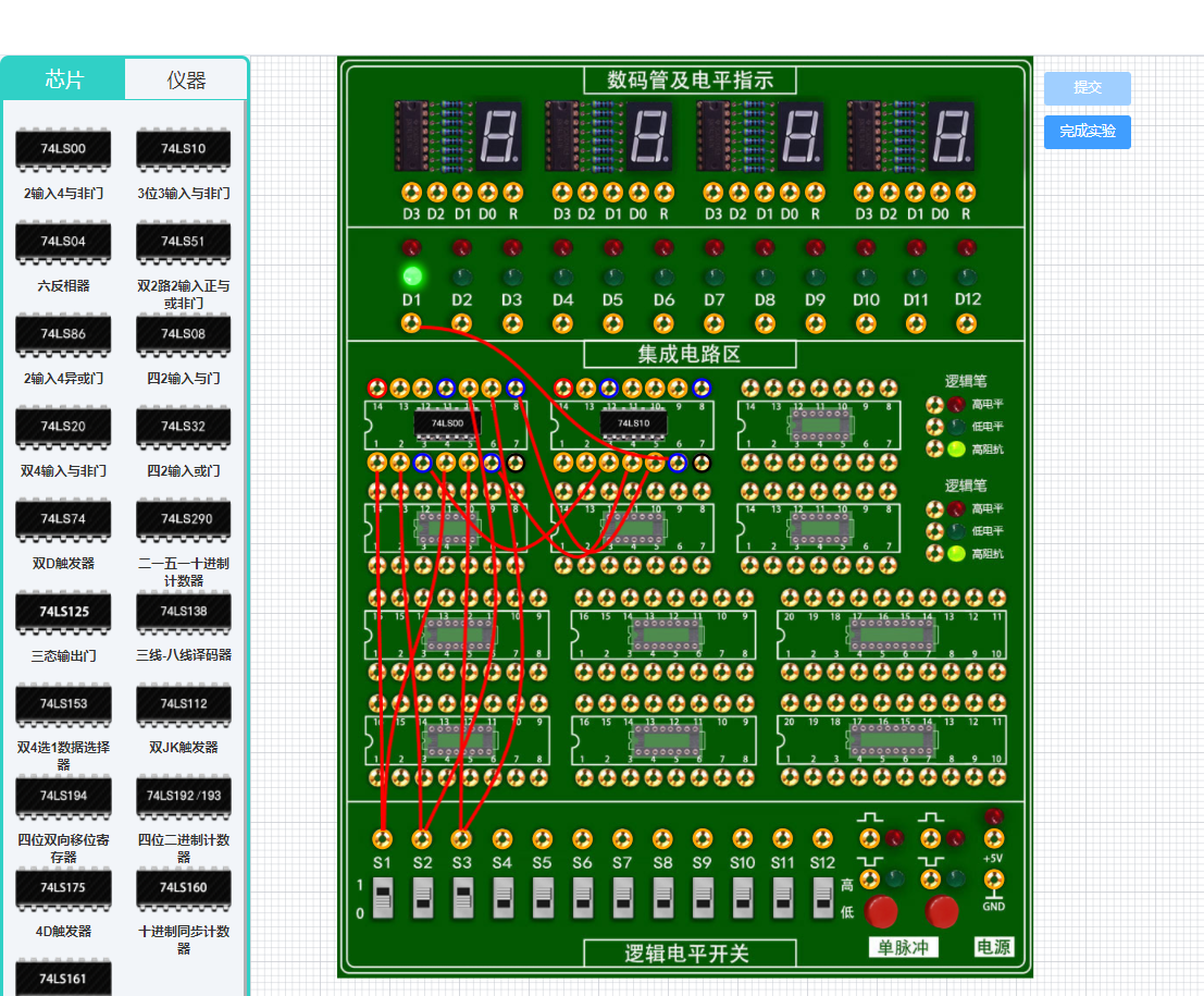 左侧是实验中常用的逻辑芯片组件区,右侧是实验模块选择区,我们做实验时,先在左侧逻辑芯片组件区选择需要用到的芯片,通过鼠标点击拖动到右侧集成电路区对应的管座上即可进行实验,如图1-2。