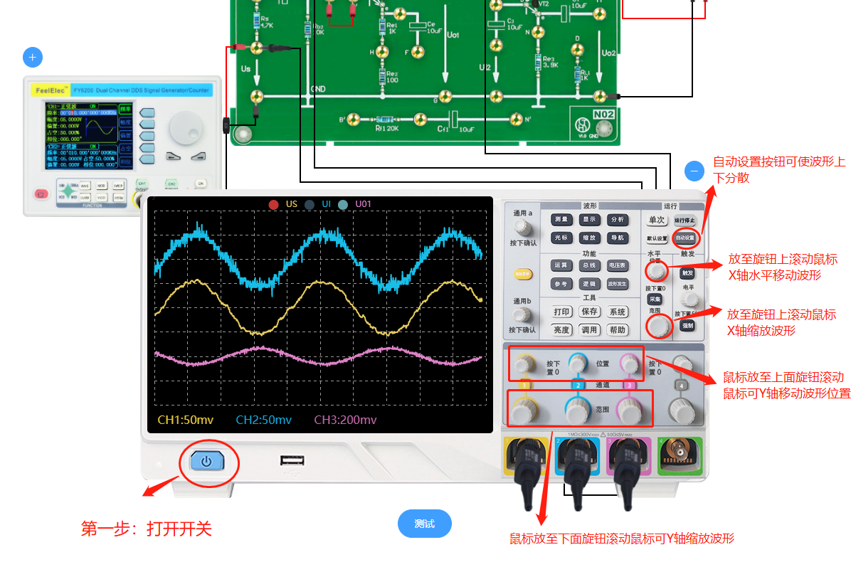 示波器调节:单击“仪器仪表选择区”的 “示波器”,示波器出现在实验操作界面,单击示波器右上角的 **“蓝色+”**号,放大示波器进行调节,示波器调节界面如图1-1所示。单击示波器右上角的 “蓝色-” 号,缩小示波器,恢复实验操作界面,小图模式可进行示波器与电路板的连接。